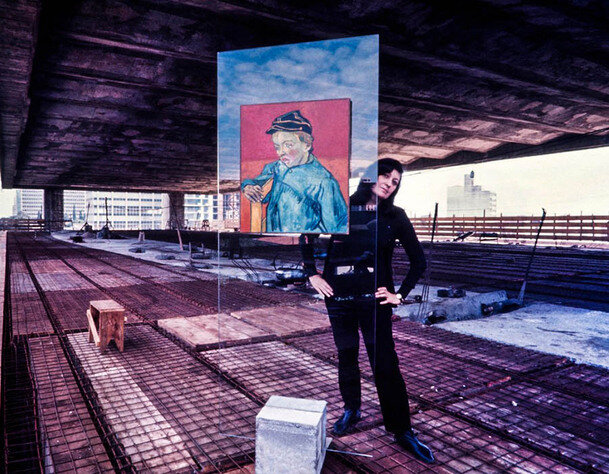 Esta fotografia da década de 1960 registra a arquiteta junto às obras do museu.