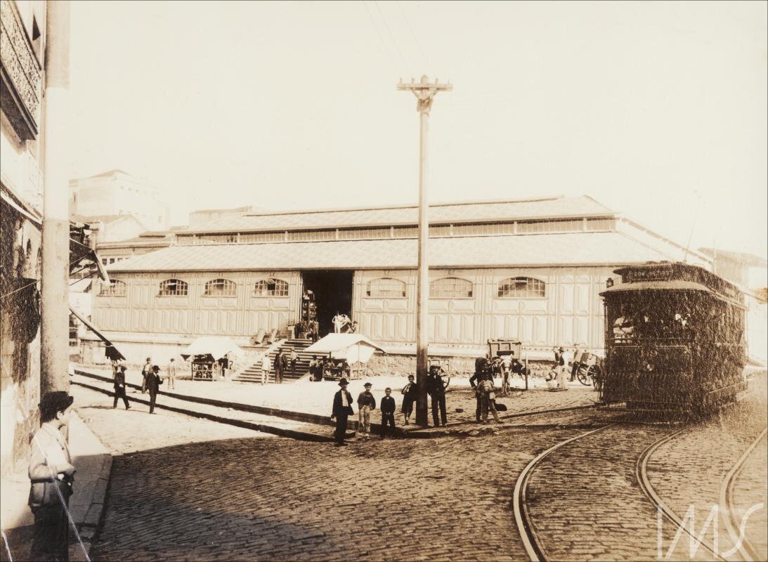 Esta fotografia da década de 1900, além de registrar a circulação dos bondes, evidencia também a presença do Mercado da rua São João.